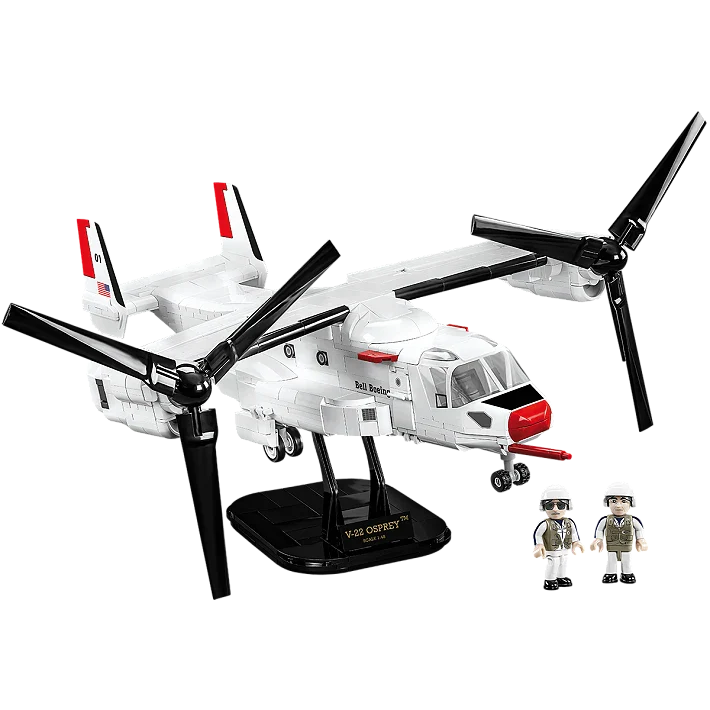 The COBI model of the Bell-Boeing V-22 Osprey was released under the license of the American manufacturer of combat helicopters, Bell Helicopter Textron. Developed in 1:48 scale to match the rest of the Armed Forces collection, the model consists of 1136 elements and includes two figures depicting the first test pilots in distinctive uniforms. The length of the model is 390 mm, the width is 500 mm! Completely new elements have been developed for the set, which make our model even better! Numerous detailed prints capture the look of the signature test paint. The most important functionalities of the model are the drive nacelles, which can be set in different positions, rotating rotor blades, opening cabin doors with stairs, access to the cockpit and the possibility of placing figures there, and an opening rear loading hatch.