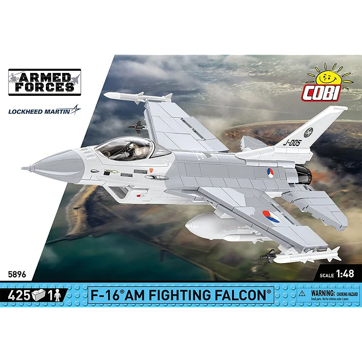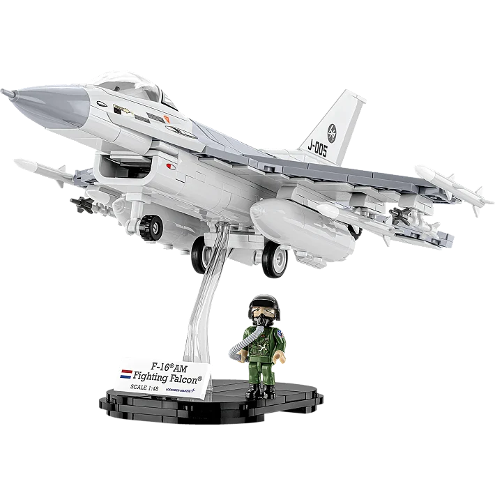 With 425 of the highest quality COBI construction blocks you can build the world's most popular fighter-attack aircraft, the F-16® AM FIGHTING FALCON® in Dutch colors (DUTCH AIR FORCE). The set has been carefully designed in a modeling scale of 1:48 and the blocks are covered with high-quality prints. The aircraft also has suspended AIM-9 SIDEWINDER and AIM-120 AMRAM missiles. The armament is detachable and can be freely configured or placed on other planes from the Armed Forces collection! The set includes a figure of a Dutch pilot equipped with a helmet and an oxygen mask with a hose. It has prints containing patches of the Dutch Air Force and F-16 pilots. The whole set is complemented by a block display stand with a plate containing the name of the set, the national flag and the Lockheed Martin logo.