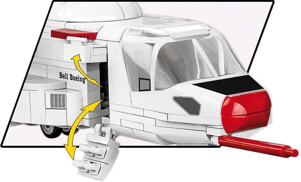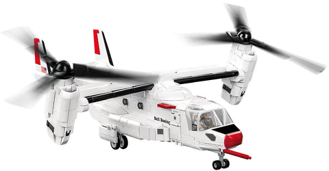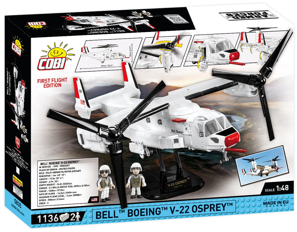 The COBI model of the Bell-Boeing V-22 Osprey was released under the license of the American manufacturer of combat helicopters, Bell Helicopter Textron. Developed in 1:48 scale to match the rest of the Armed Forces collection, the model consists of 1136 elements and includes two figures depicting the first test pilots in distinctive uniforms. The length of the model is 390 mm, the width is 500 mm! Completely new elements have been developed for the set, which make our model even better! Numerous detailed prints capture the look of the signature test paint. The most important functionalities of the model are the drive nacelles, which can be set in different positions, rotating rotor blades, opening cabin doors with stairs, access to the cockpit and the possibility of placing figures there, and an opening rear loading hatch.